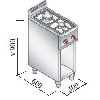 Pracovní plocha a opláštění z nerez oceli AISI 304. Litinový hořák s pojistným termostatem. Kompaktní provedení s otevřeným podstavcem.